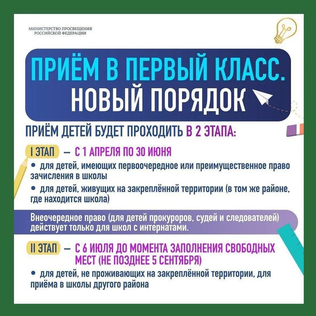 Прием заявлений в первый класс для детей, имеющих право на внеочередной или первоочередной прием, право преимущественного приема, детей, проживающих на закрепленной территории, начинается не позднее 1 апреля и завершается 30 июня текущего года.